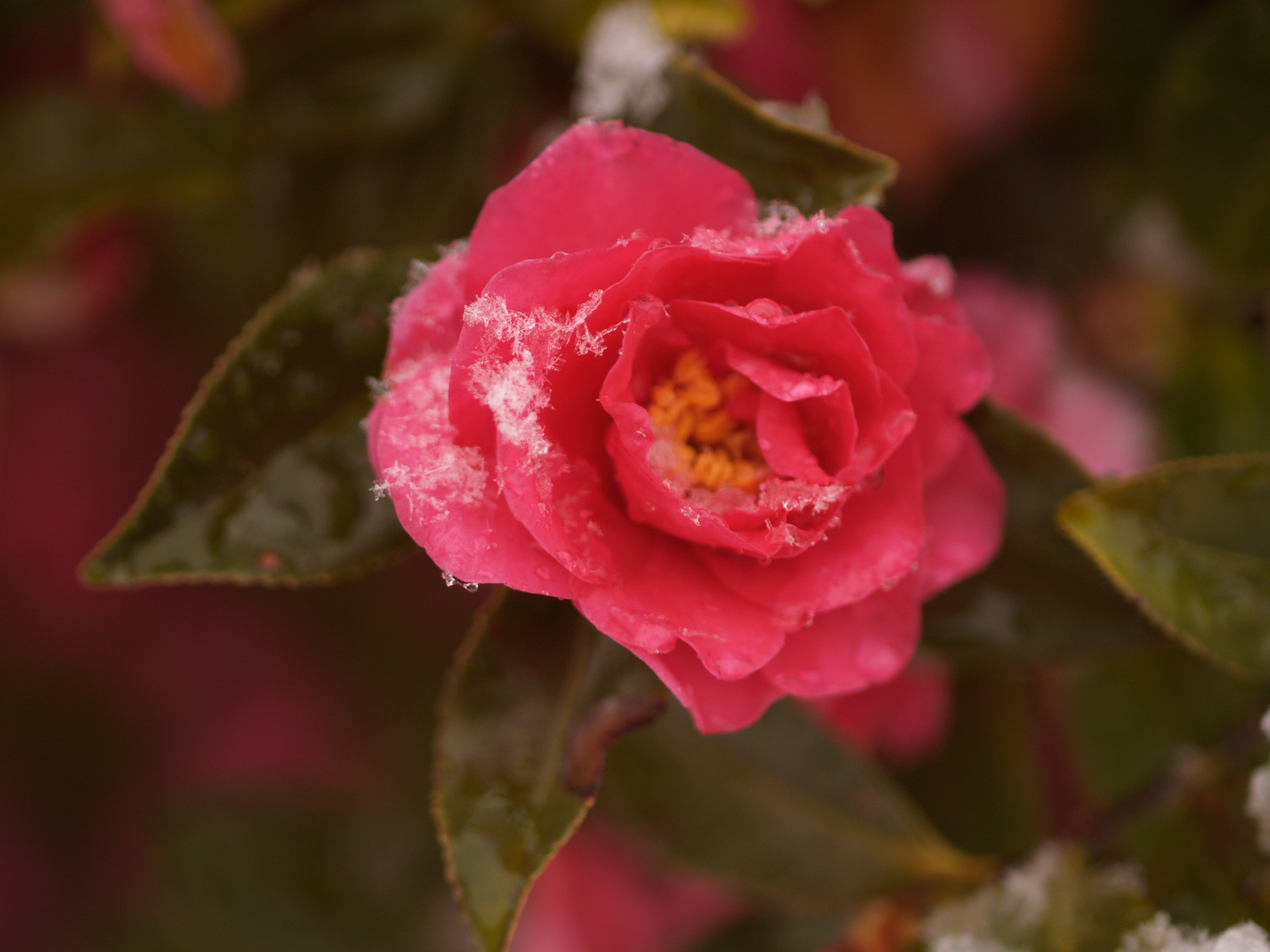 カンツバキだと思います。品種にはトンと疎くて。その割に花の写真をよく撮るんですけどね。雪の日に花を撮るのは初体験だったりします。