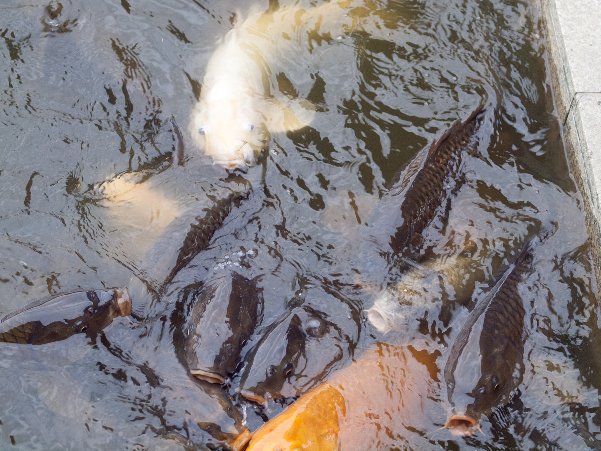 コイのエサが売っていたので、ウチの奥さんが買ってあげました。デカイのがウヨウヨ寄ってきたので、キモチワルイ感を出したいと思って撮った一枚。