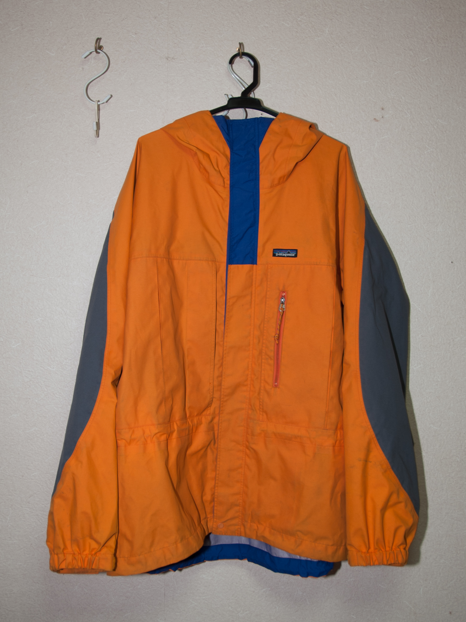 ご自慢のPatagoniaトーレジャケット。古いジャケットですから、ずいぶん小汚くなってきました。色はマンゴーですが、最近は自転車に乗るときも着ています。